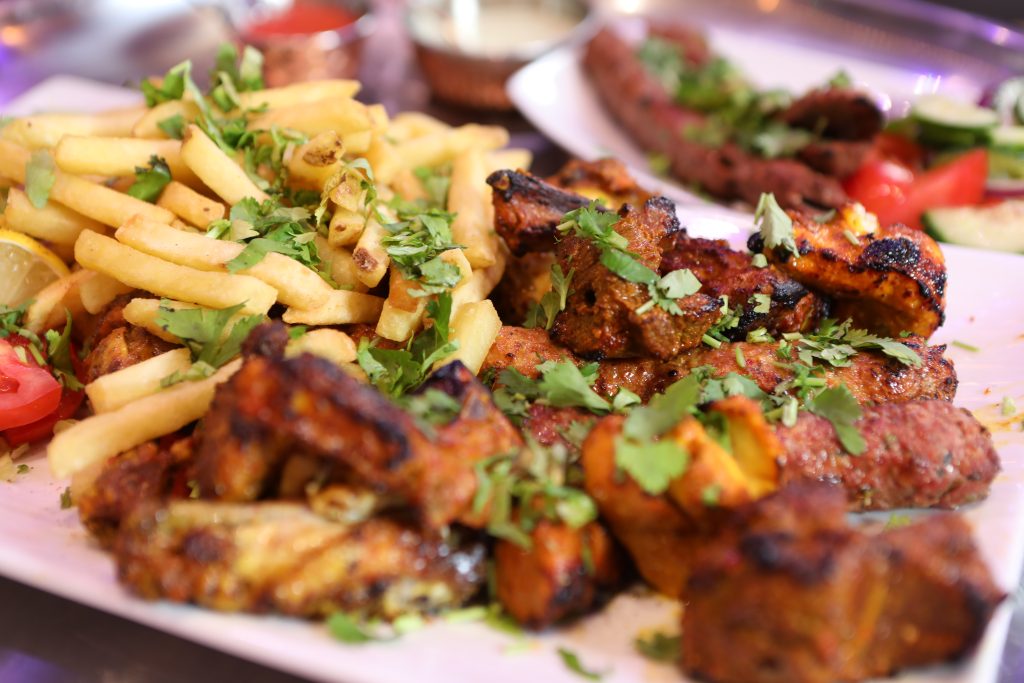 Chicken leg, chicken tikka (2), lamb tikka (2), wings (2), lamb chops (2), seekh kebab (2) & fries