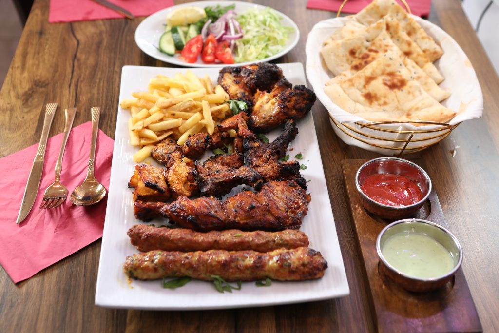 Chicken leg(2), chicken tikka (3), lamb tikka (3), wings (3), lamb chops (3), seekh kebab (3) & fries